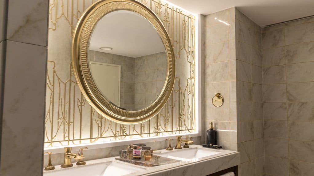 Let’s shift from cozy bath mats to another way to elevate your apartment bathroom with unique mirror designs. You’re not just hanging a mirror; you’re creating a focal point with style. Choose designs like a 24-inch round mirror with a gold frame or a 30×40-inch rectangular one with LED backlighting for a modern touch.