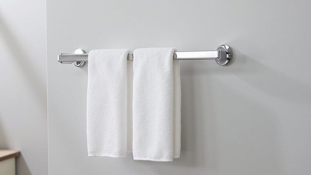 As you refine your apartment bathroom’s look, consider upgrading to modern towel racks for both function and flair. These sleek designs, often in chrome or matte black, maximize space and style. Look for wall-mounted racks, around 24-36 inches wide, to fit small bathrooms. Install them within 48 hours of purchase to avoid clutter.