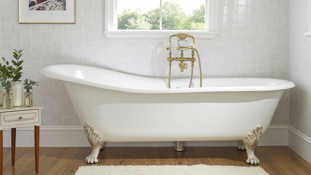 Let’s elevate your vintage bathroom by adding a stunning clawfoot tub as the centerpiece of your space. This classic piece, often 60-70 inches long, instantly boosts charm and function. Plan for installation in a weekend, guaranteeing a 3-foot clearance around for easy access.