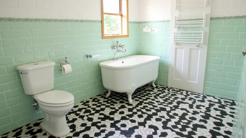 As you refine the vintage vibe of your bathroom with brass fixtures, let’s immerse ourselves in the bold charm of retro tile patterns. They’re a striking way to revive your space! Focus on classic designs from the 1950s and 60s for authenticity.