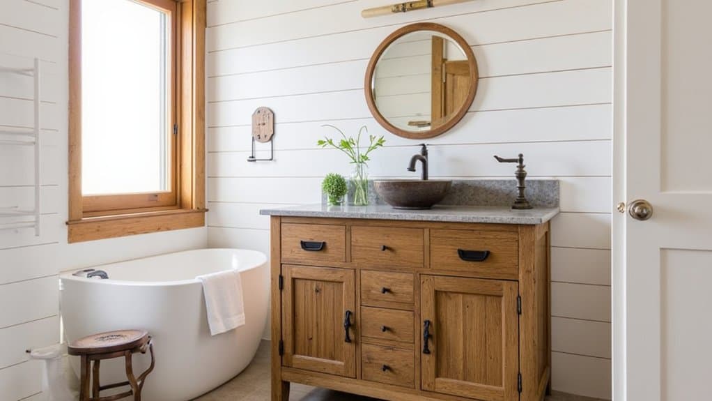 Transforming your bathroom’s look can start with a rustic wooden vanity to complement that vintage vibe. You’ll love how this piece, ideally 36 inches wide and 22 inches deep, anchors the space with warmth. Install it yourself over a weekend, guaranteeing a level fit with a 2-inch wall clearance.