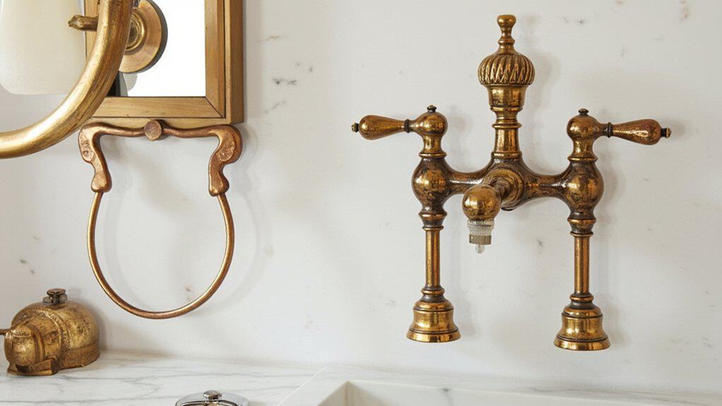 Moving from the charm of a vintage mirror, let’s focus on adding warmth with antique brass fixtures. These pieces instantly elevate your old bathroom with a timeless glow. You’ll want to choose items that fit your space, so measure carefully before buying.
