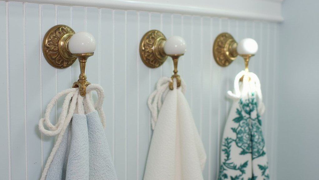 Nostalgia shines through when you add old porcelain knob hooks to your vintage bathroom makeover. These classic pieces, often 2-3 inches in diameter, bring charm while serving a purpose. You can find them at antique stores or online, guaranteeing they’re sturdy for daily use.
