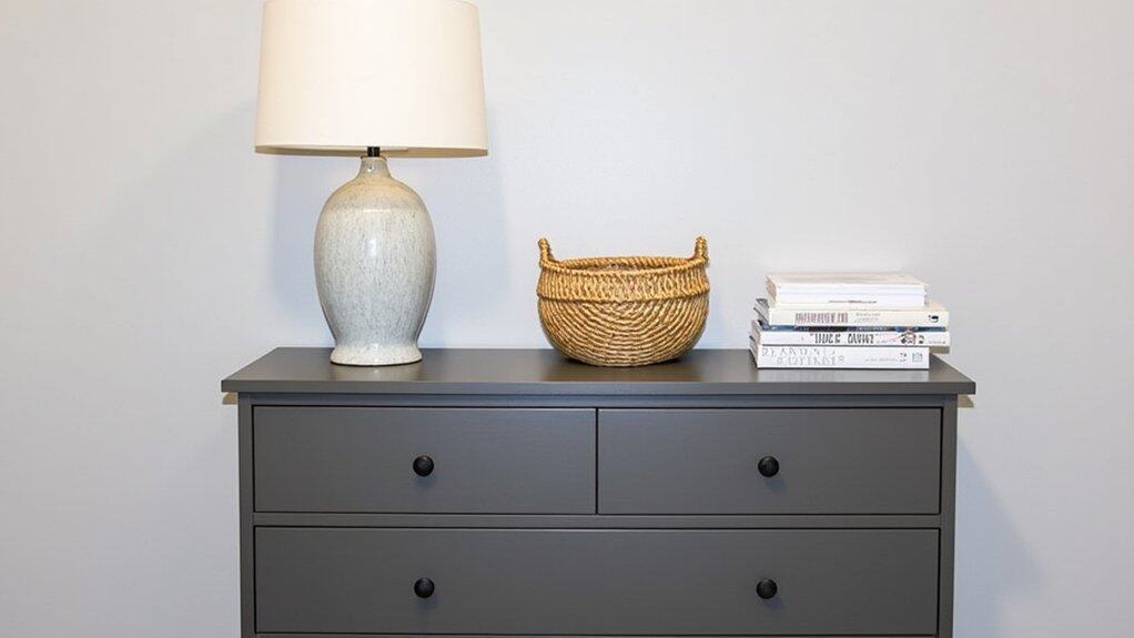 Let’s move to the charcoal dresser, another bold piece to anchor your bedroom’s dark furniture vibe. You’re setting a strong tone with this 60-inch wide, 18-inch deep dresser, perfect for a moody aesthetic. Place it against a light gray wall for contrast, ensuring it’s centered for balance.