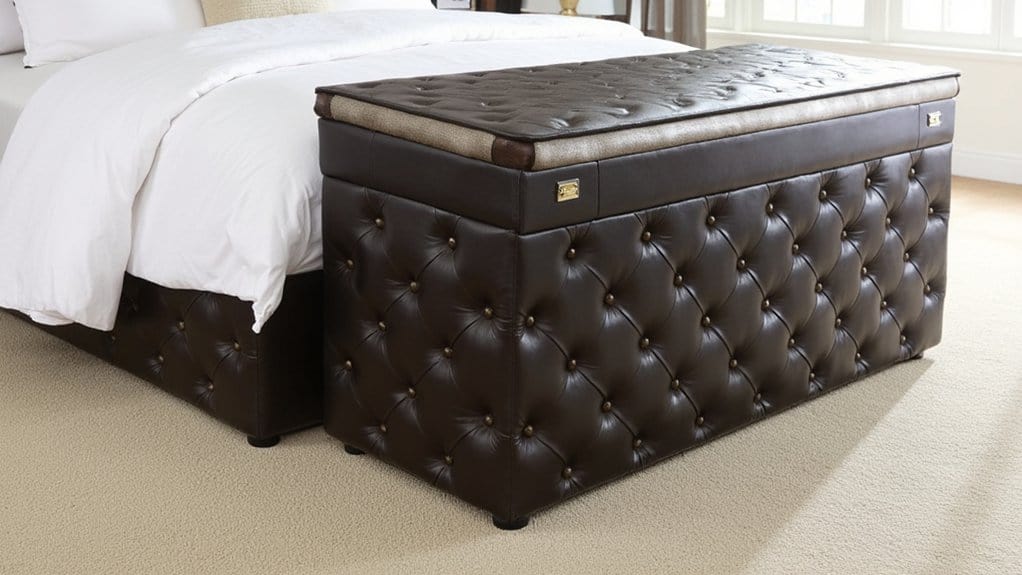 While enhancing your bedroom’s style, don’t overlook the Sable Storage Ottoman as a functional yet chic addition. This piece, measuring 36 inches wide, 18 inches deep, and 18 inches high, fits perfectly at your bed’s foot. It’s got hidden storage for blankets or pillows, keeping clutter out of sight.