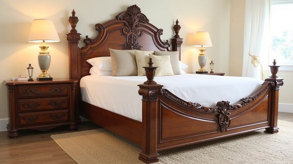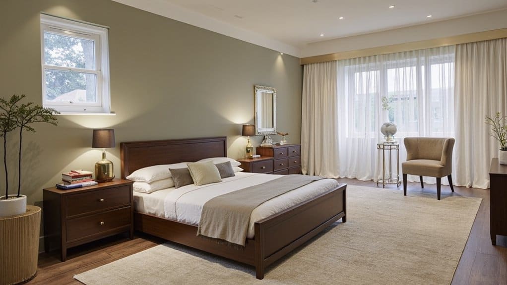 While decorating a bedroom with dark furniture can feel tricky, starting with a mahogany bed frame sets a bold foundation. You’ve got a rich, warm tone that anchors the room, so let’s build from there. Pick a frame around 80 inches long for a queen size, ensuring it fits your space.