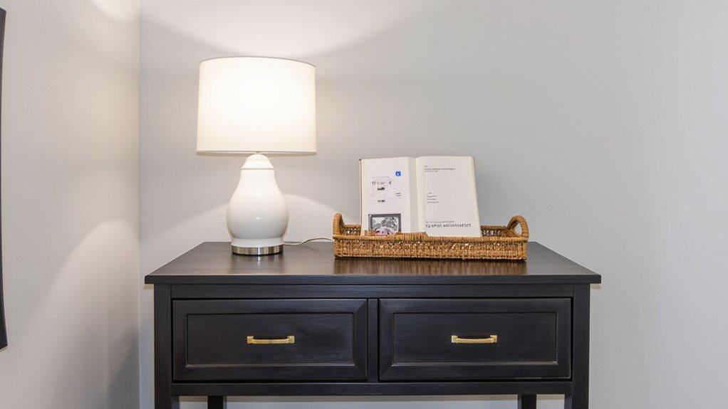 Shifting to an ebony nightstand, you can elevate the sophistication of your bedroom alongside that mahogany bed frame. Pick a piece about 24 inches wide and 28 inches tall to match standard bed heights. It’s gotta have storage—think two drawers for essentials like books or chargers.