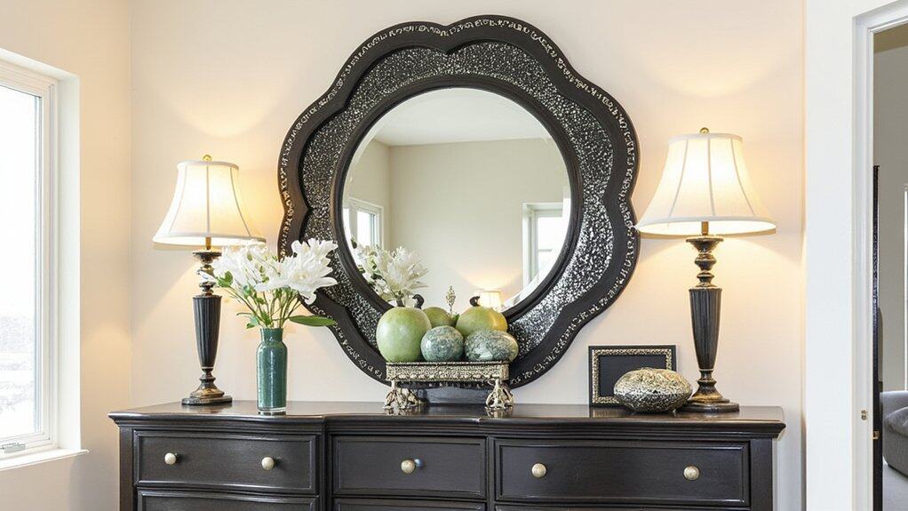 As you style your bedroom with dark furniture, turn your attention to the onyx wall mirror for a striking focal point. This piece, with its deep black frame, adds elegance instantly. Hang it above your dresser, ensuring it’s centered at eye level, about 60 inches from the floor.