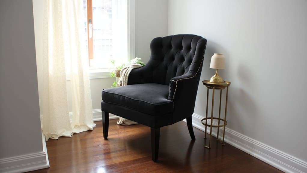 Dive right into elevating your bedroom with a Raven Accent Chair, a bold match for dark furniture. This chair, measuring 30 inches wide and 34 inches deep, instantly adds sophistication near your ebony dresser. Place it in a corner for a cozy reading nook; it’ll transform your space within minutes.