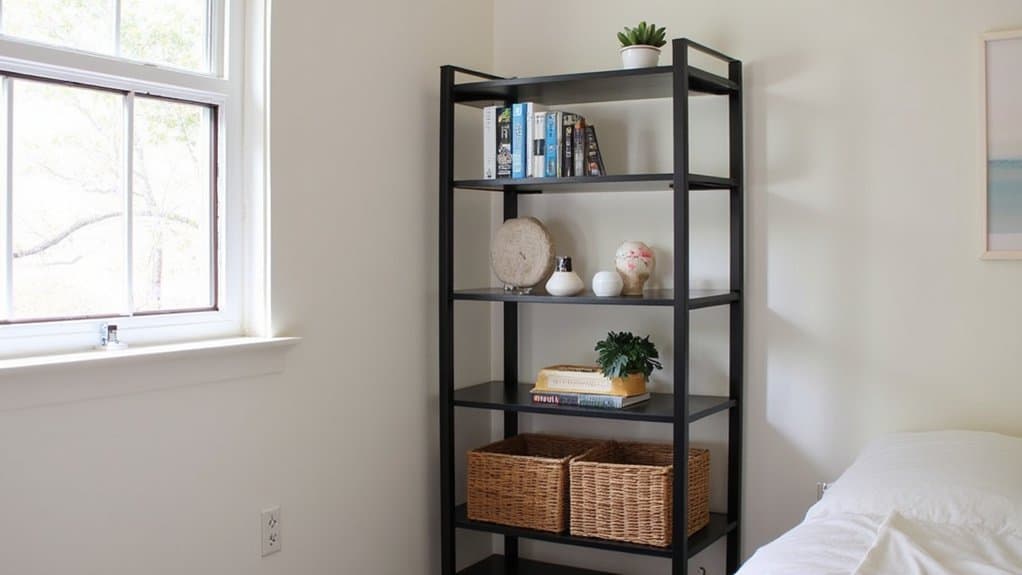 While you’re building a cohesive look with dark furniture, consider adding a black bookshelf to elevate your bedroom’s style and storage. A tall, 6-foot bookshelf with a 30-inch width fits nicely in most corners, maximizing space. Install it within an hour using basic tools for instant impact.
