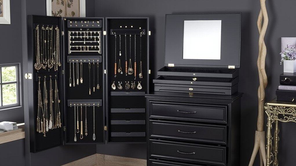 Obsidian magic awaits with an obsidian jewelry armoire, a striking addition to your bedroom’s dark furniture theme. You’ll love how this 36-inch tall, 18-inch wide piece stores your treasures with sleek, black lacquered wood. Place it in a corner; it’s perfect for tight spaces.