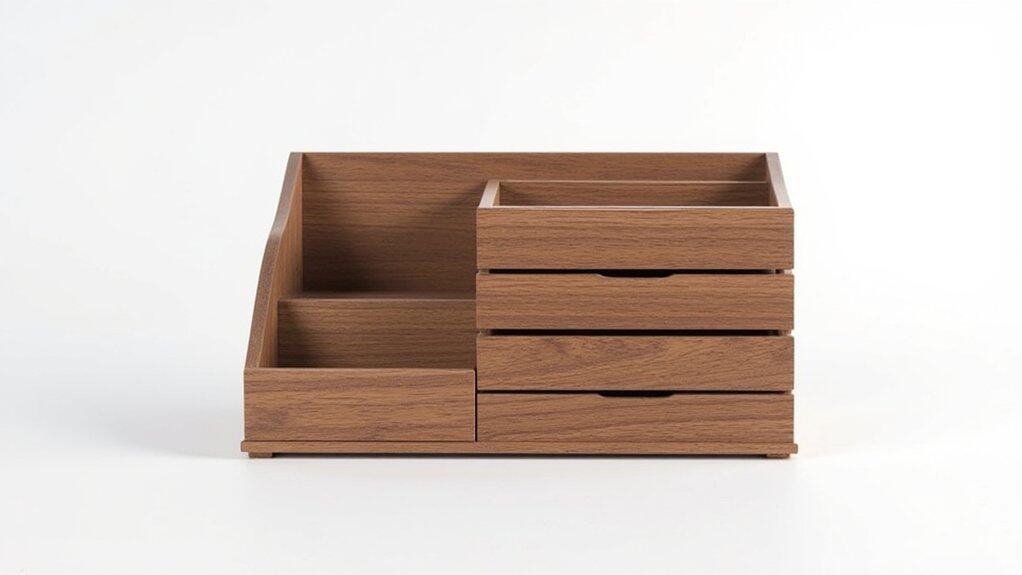 Three essential elements can transform your bedroom workspace, and a walnut desk organizer tops the list. You’re creating order with this sleek, dark piece, measuring about 12 inches wide by 6 inches deep. It’s perfect for pens, clips, and sticky notes, keeping clutter off your desk.