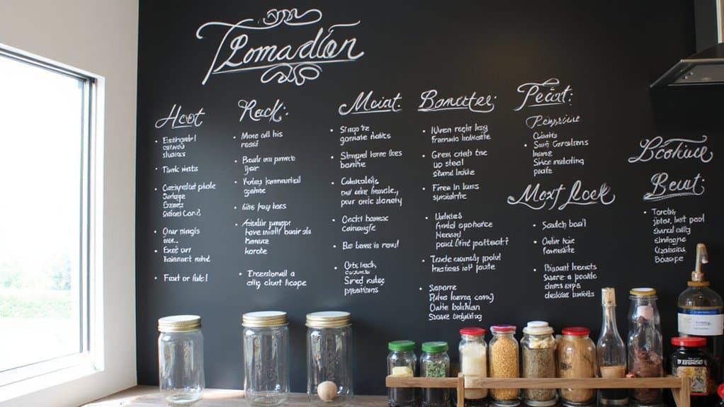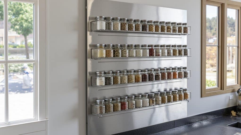 As you continue to revamp your kitchen walls, consider installing a magnetic spice rack wall for both style and function. It’s a practical way to organize spices while saving counter space. Mount a 24-inch by 12-inch magnetic board on your wall, ensuring it’s at eye level for easy access.