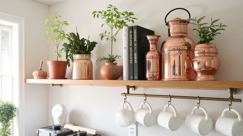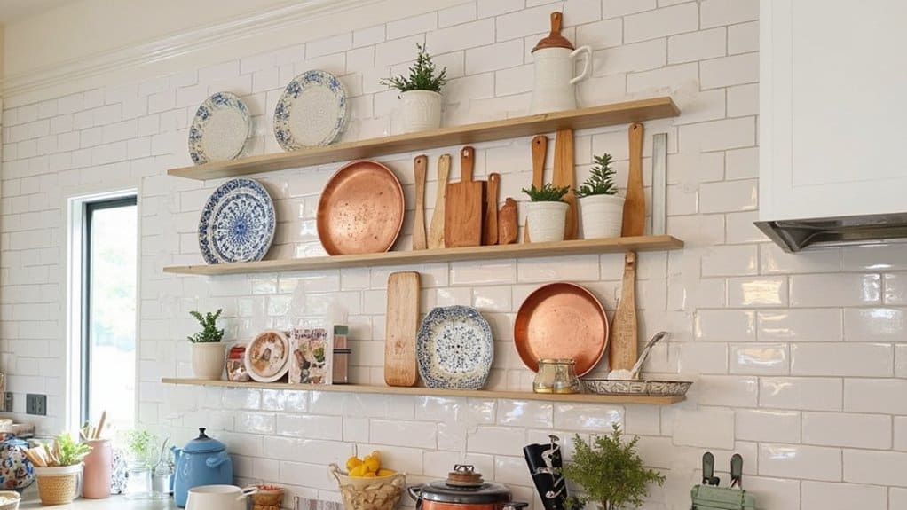 Moving from vintage kitchen signs that add a nostalgic charm, let’s explore another way to boost your kitchen’s style with floating wooden shelves. These versatile additions bring warmth and function to your walls. You can install them yourself in about two hours with basic tools. Use shelves measuring 24 inches long and 8 inches deep for ideal spacing.