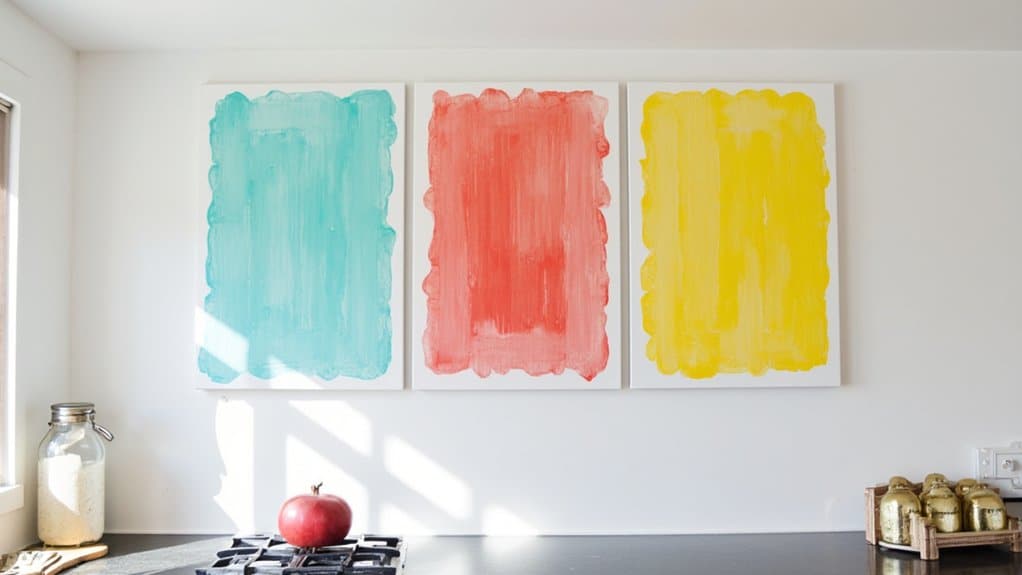 How can you brighten up your kitchen walls with a splash of personality? Immerse yourself in colorful wall art! You can transform your space in just a weekend with vibrant pieces that catch the eye. Hang a 24×36-inch canvas print above your counter for a bold focal point.