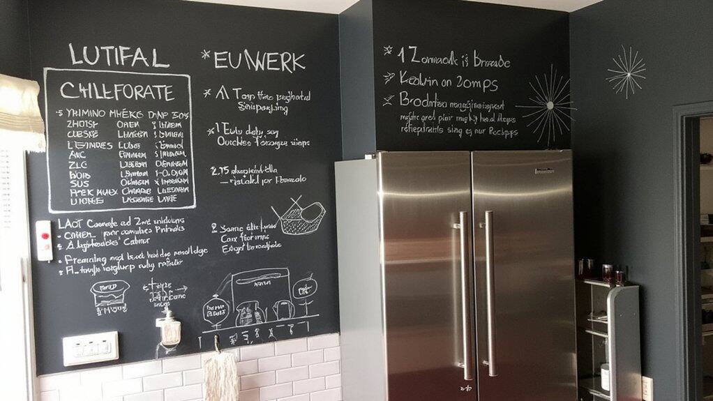 Switching gears to a fun and functional idea, consider transforming one of your kitchen walls with chalkboard paint for a unique touch. It’s an easy DIY project that adds personality and usefulness. Use a 6×4-foot section, apply two coats of chalkboard paint, and let it cure for 48 hours.