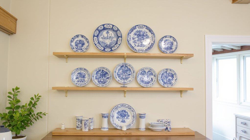 Transform your kitchen wall with a decorative wall-mounted plate rack for a blend of style and function. You can display your favorite dishes while saving cabinet space. Choose a rack around 36 inches wide to fit most walls, and install it 5 feet from the floor for easy reach.