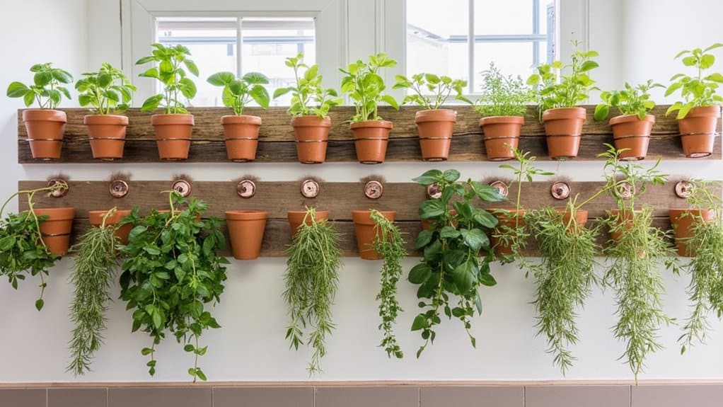 Moving from the charm of vintage clocks, let’s explore a fresh idea with a hanging herb garden on your kitchen wall. Transform that empty space into a lively, green feature. You’ll need a 24-inch by 18-inch wooden frame, small pots, and herbs like basil or mint.