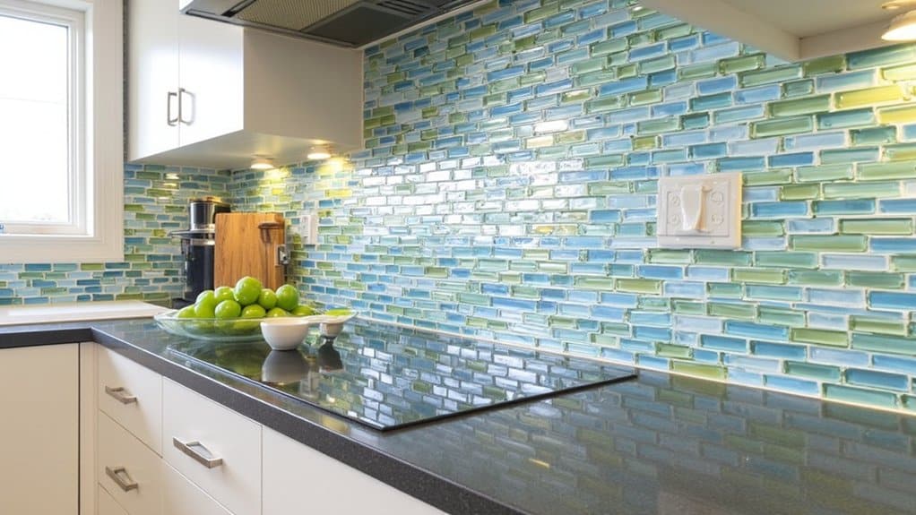 - Tiny glass tiles shimmering under your kitchen lights, reflecting soft blues and greens.