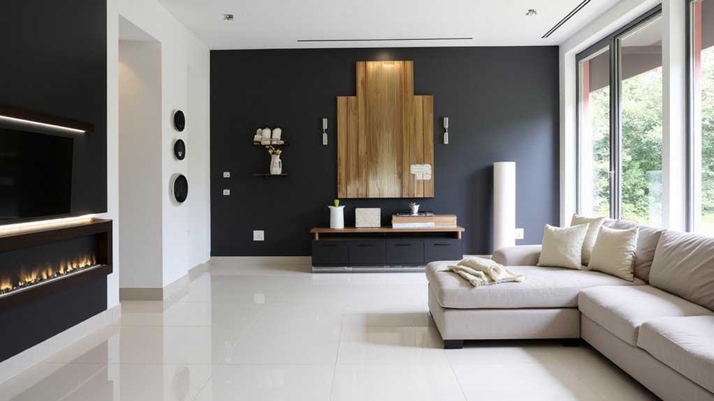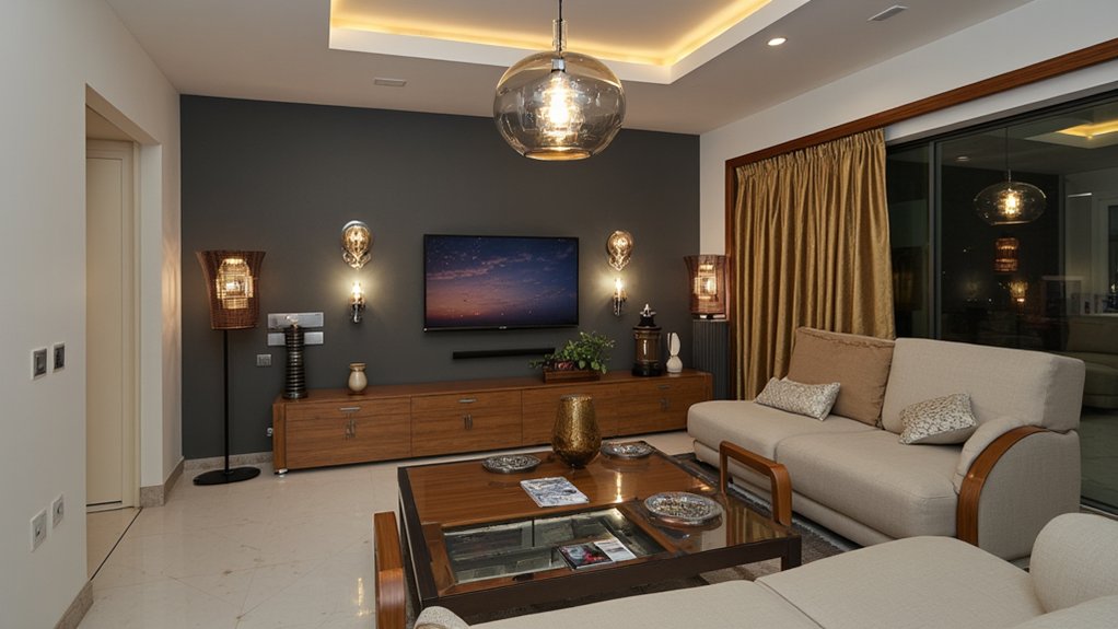 Tinted glass lighting fixtures help transform your living room’s ambiance while complementing a dark accent wall. According to lighting designer Sarah Chen, “The key is selecting fixtures that create both mood and functionality.” You’ll want to reflect on placement carefully for maximum impact.