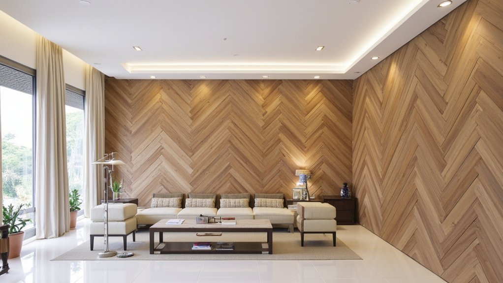 Transform blank walls into stunning architectural features with herringbone wood panels that add depth and visual interest. “Herringbone patterns create an elegant, high-end look that’s surprisingly achievable for DIY installers,” notes interior designer Sarah Chen.