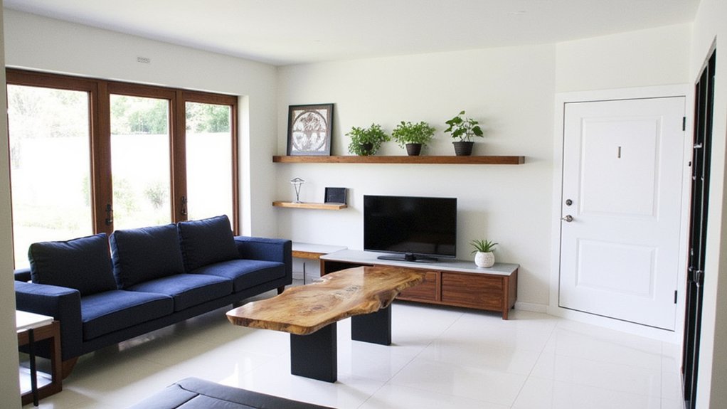 - Install floating wooden shelves (24-36 inches wide) to display art and plants