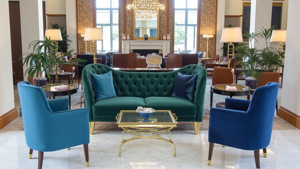 - Select pieces with tufted details and brass or gold legs to enhance the luxurious appeal