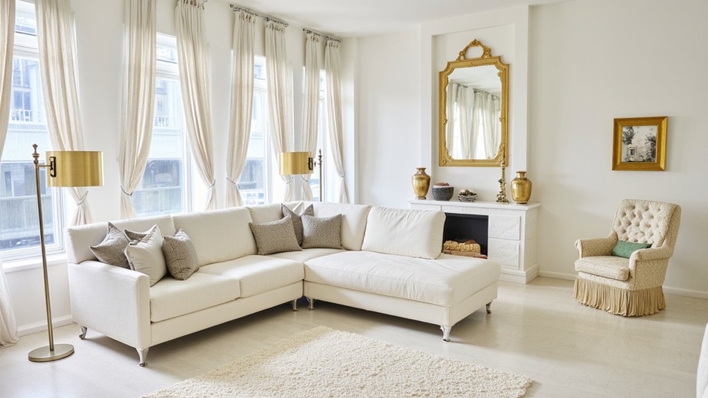 - Place a gold-framed mirror (24-36 inches) above your white sofa to reflect natural light