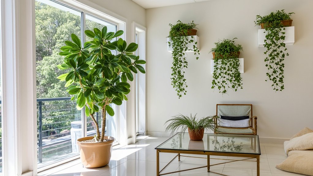 - Position a 6-foot tall Fiddle Leaf Fig as your room’s focal point, placing it 2 feet from windows