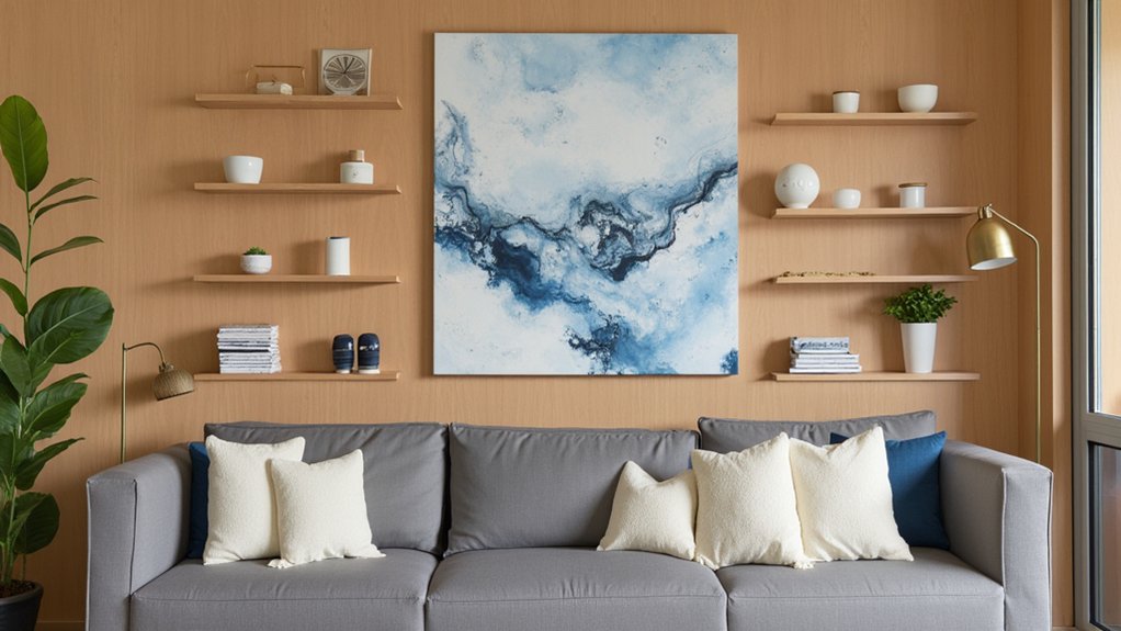 While your accent wall provides the perfect backdrop, creating a modern art gallery brings personality and visual interest to your living room. “The key is choosing pieces that speak to you while maintaining cohesion through consistent framing or color themes,” says gallery curator Rachel Martinez.