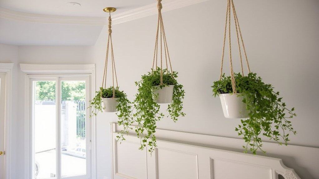 As you explore creative ways to enhance your small bedroom, consider ceiling-hung plant holders for a touch of greenery. They save floor space and add a calming vibe above your queen bed. Install them securely with a stud finder, aiming for a height of 7-8 feet.