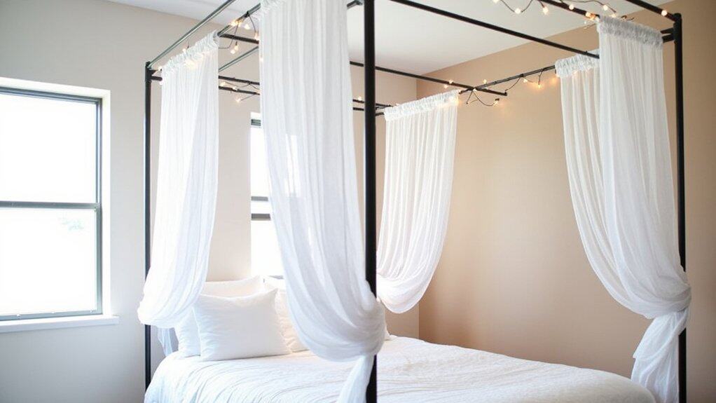 Transforming your small bedroom with an over-bed canopy frame adds style and a cozy vibe without eating up floor space. You’re maximizing height, not width, so your queen bed fits perfectly. Install a frame (about 80 inches tall) in 2-3 hours with basic tools.