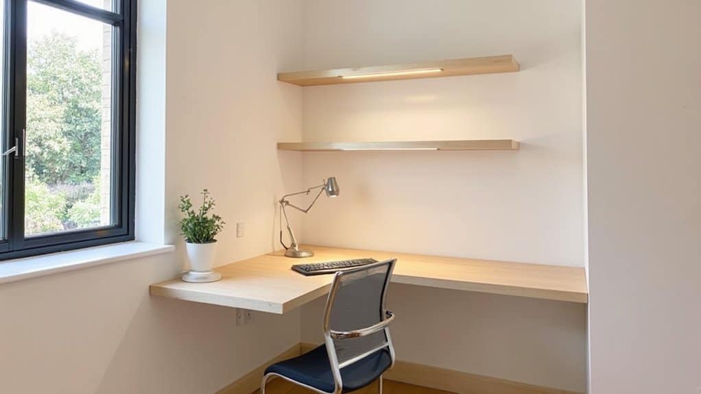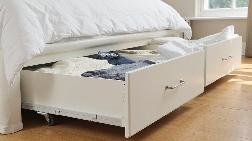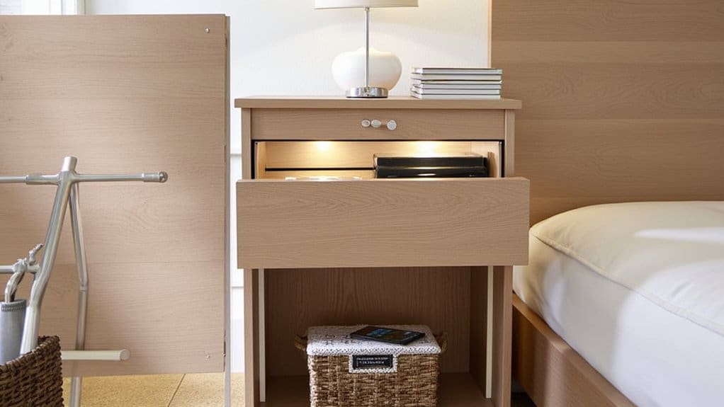 As you maximize your small bedroom’s potential, consider upgrading to a multipurpose nightstand for clever storage solutions. These compact pieces, often around 24 inches wide and 18 inches deep, can transform clutter into order within a 2-hour setup. “A nightstand with built-in drawers saves floor space,” says interior designer Jane Holt.