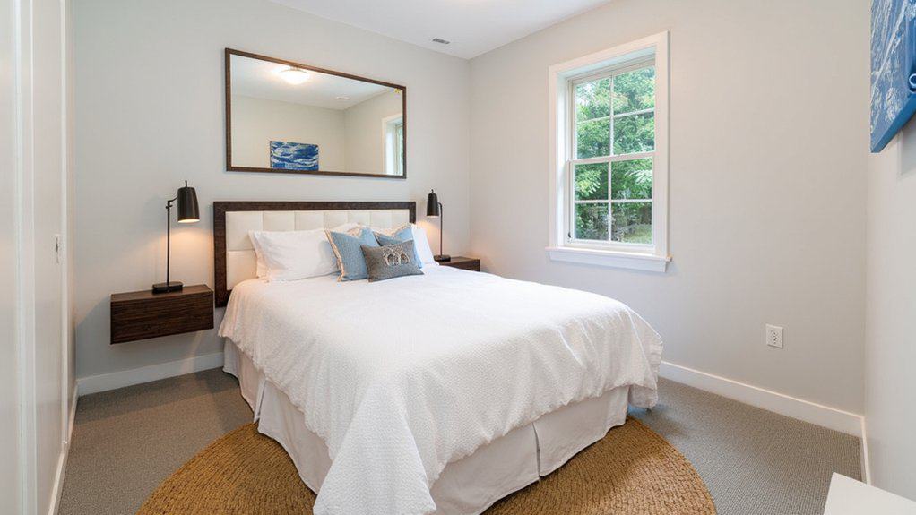 Ready to boost your small bedroom’s style and space? Mirror-enhanced wall panels can transform your room with a queen bed by reflecting light and creating depth. You’ll love how they make tight quarters feel airy! Install these panels behind your bed for maximum impact, using panels about 24×48 inches for a balanced look.
