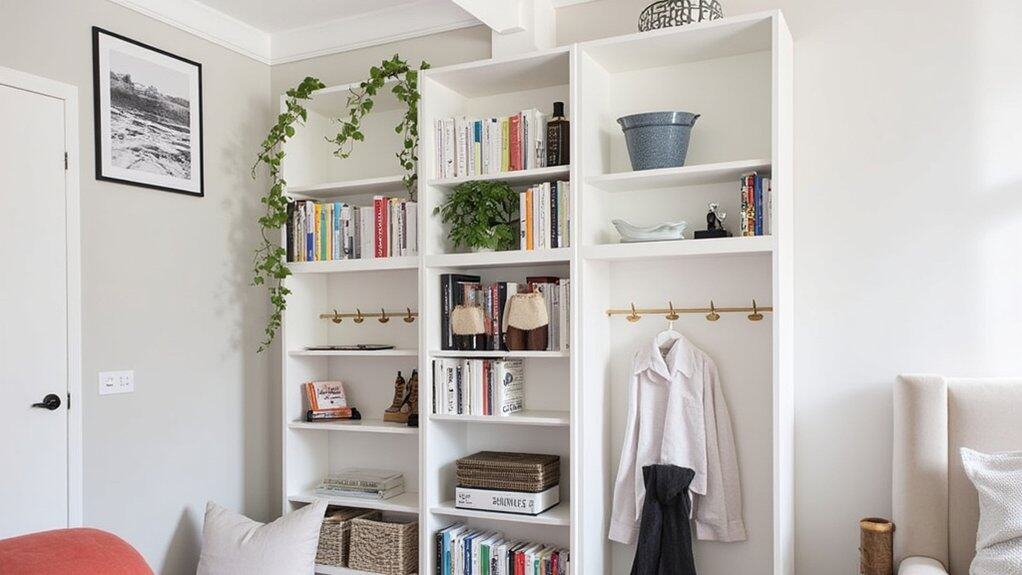 If you’re looking to maximize storage in your small bedroom, a slim bedside ladder shelf is a smart pick. It fits neatly beside your queen bed, often just 12-18 inches wide, saving precious floor space. You can install it in under 30 minutes with basic tools.