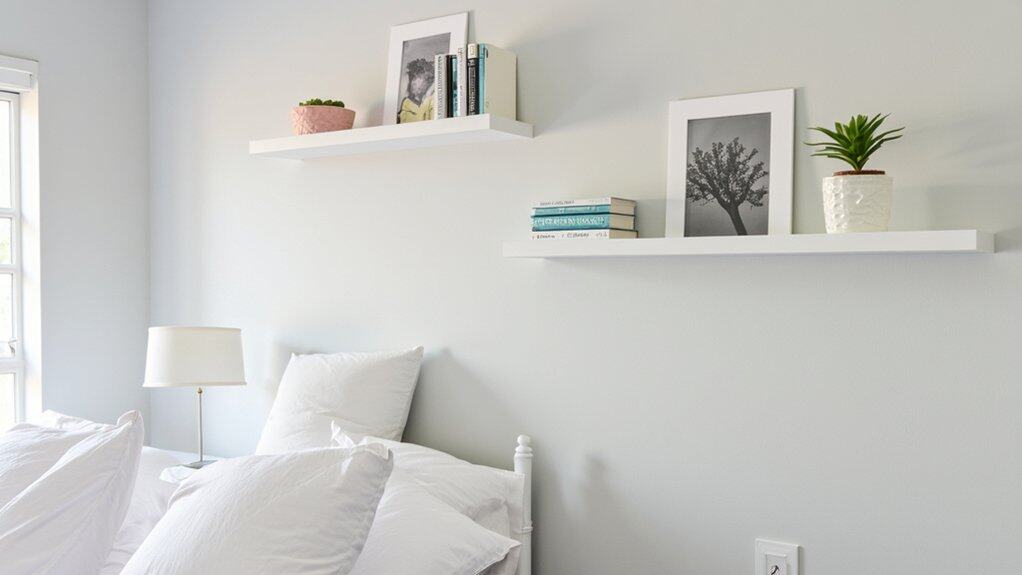 Moving from under-bed storage, let’s focus on making the most of your walls with wall-mounted shelving units. They’re perfect for a small bedroom with a queen bed, saving floor space while adding style. Install them above your bed or along a side wall within a day using basic tools.