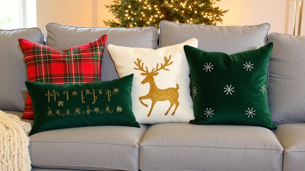- Mix textures by combining velvet, knit, and faux fur pillows in classic Christmas colors like red, green, and gold