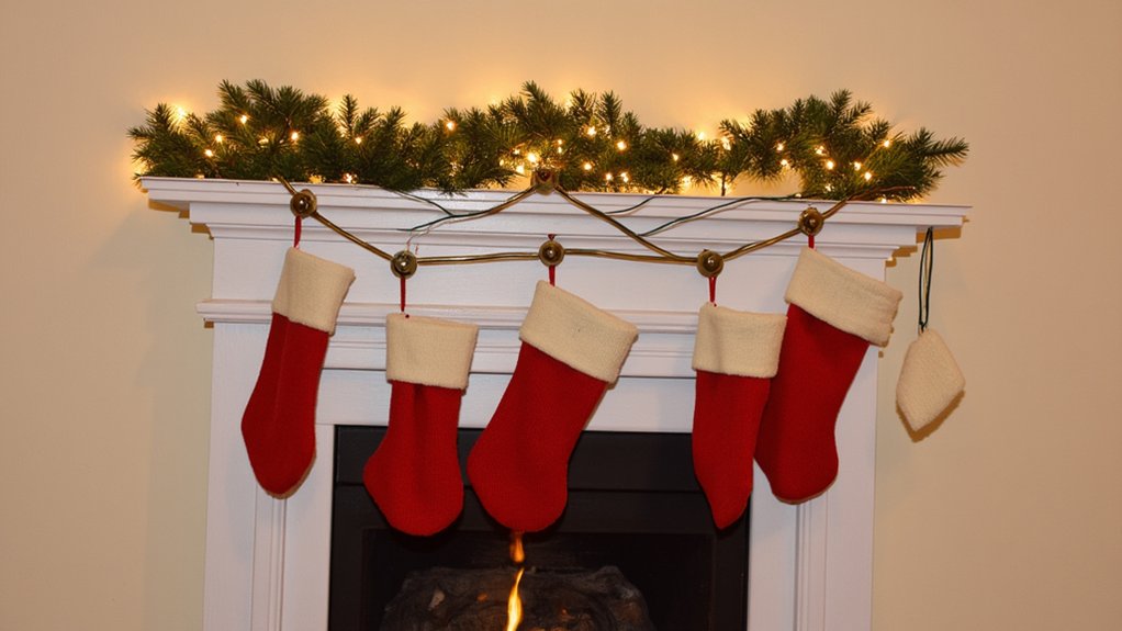 Traditional stockings hung from the fireplace mantel serve as both festive decoration and functional storage for small holiday treasures. You’ll want to space your stockings evenly, allowing 8-10 inches between each one to prevent overcrowding your mantel display.