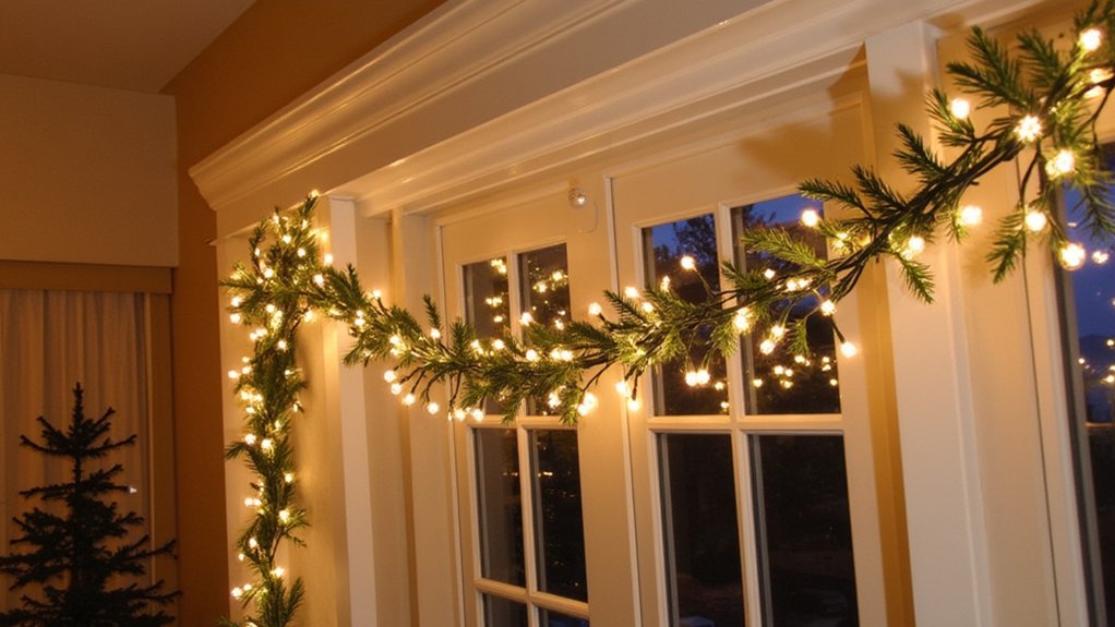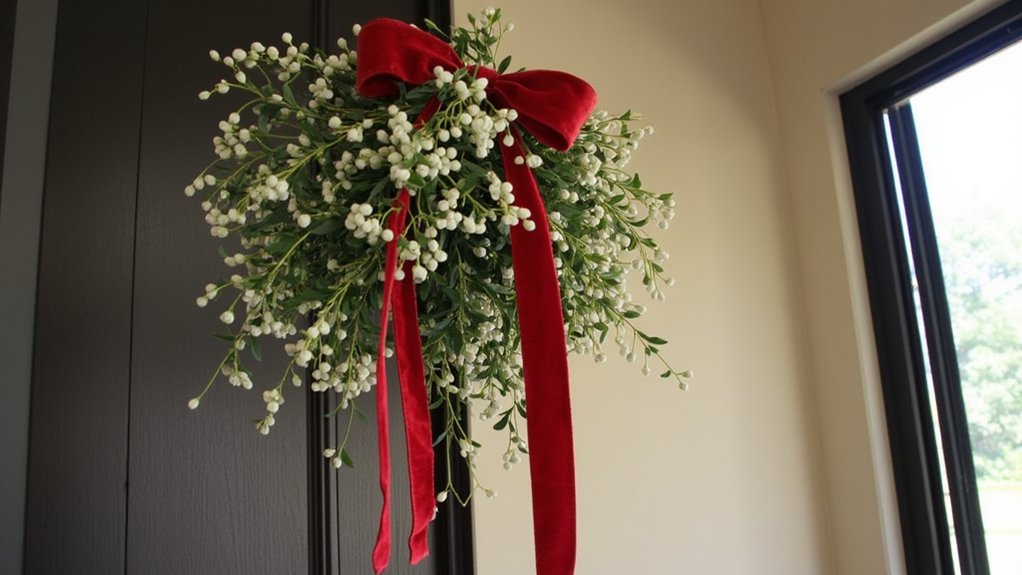 Traditional mistletoe hanging from your doorframe creates an enchanting holiday focal point while maximizing vertical space in a small living room. Interior designer Sarah Wells suggests positioning the mistletoe 6-8 inches below the top of the frame for ideal visibility. You’ll want to secure it properly to prevent sagging or falling during the season.