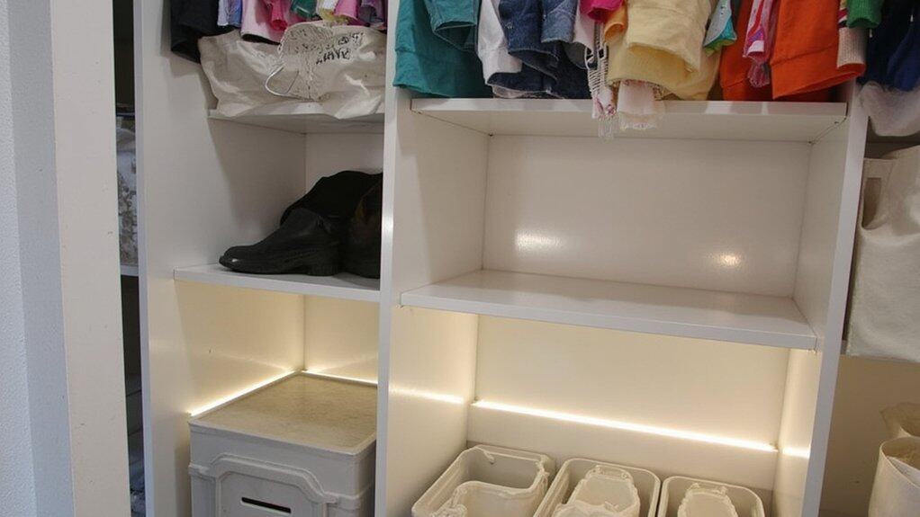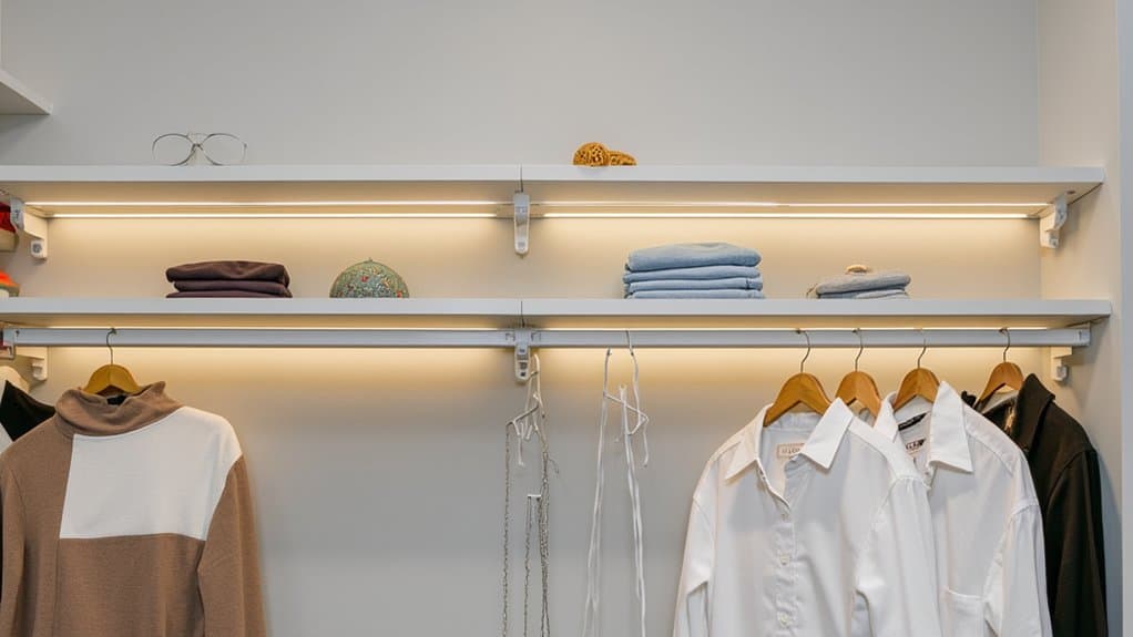 Let’s brighten up your small walk-in closet with LED lighting strips to make every corner visible. These energy-efficient lights enhance visibility and add a modern touch. You’ll need strips about 5-10 feet long, depending on shelf length, and adhesive backing for easy setup. Installation takes roughly 30 minutes.