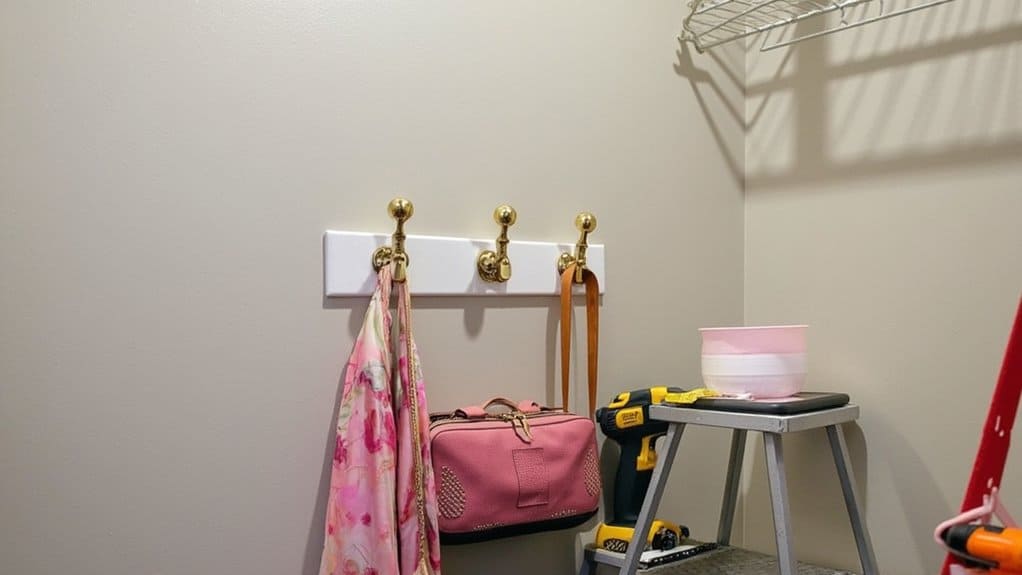 Let’s shift focus from floating shelves to another smart storage solution for your small walk-in closet. Wall-mounted hooks can maximize space when you’re short on room. They’re perfect for hanging bags, scarves, or belts, keeping things tidy.