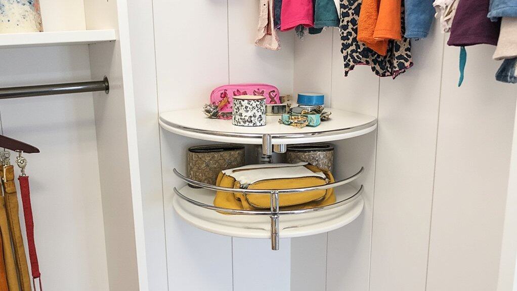 Corner spaces in a small walk-in closet often go unused, but you can change that with lazy Susans. These rotating trays maximize tricky spots, letting you access items easily. Install them in 12-inch or wider corners for best results, taking just 30 minutes per unit.
