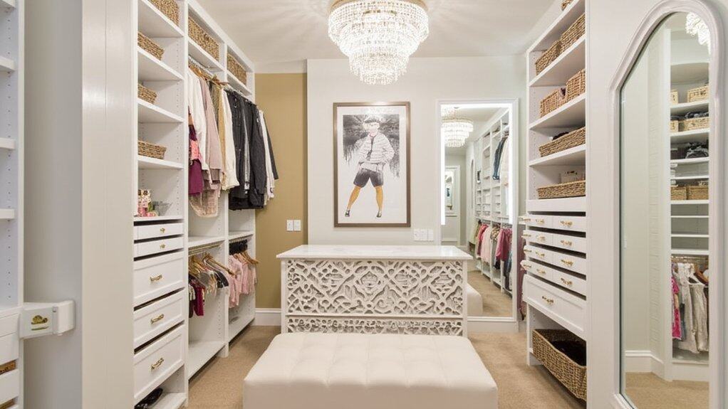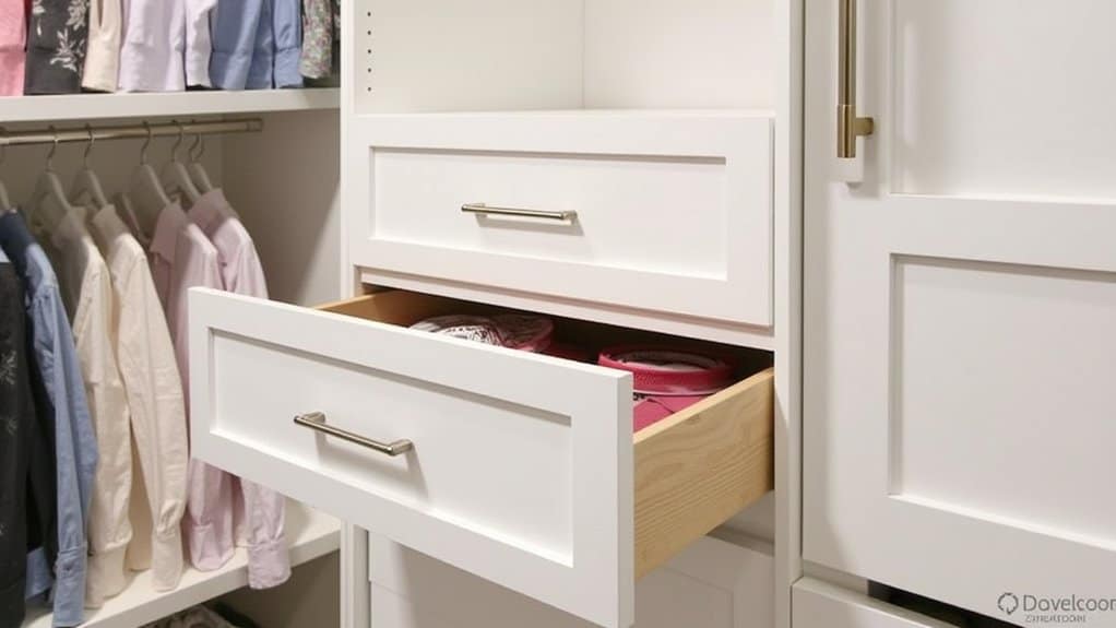 Several clever ways exist to maximize your small walk-in closet space, and pull-out drawers rank high on the list. You can transform cramped areas into organized zones with these handy additions. Install them under shelves or in narrow gaps to save space.