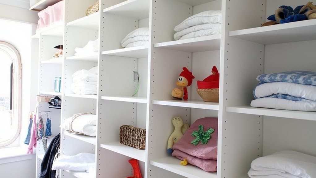 - Install shelves at 12-inch intervals – This spacing fits folded clothes or bins perfectly.
