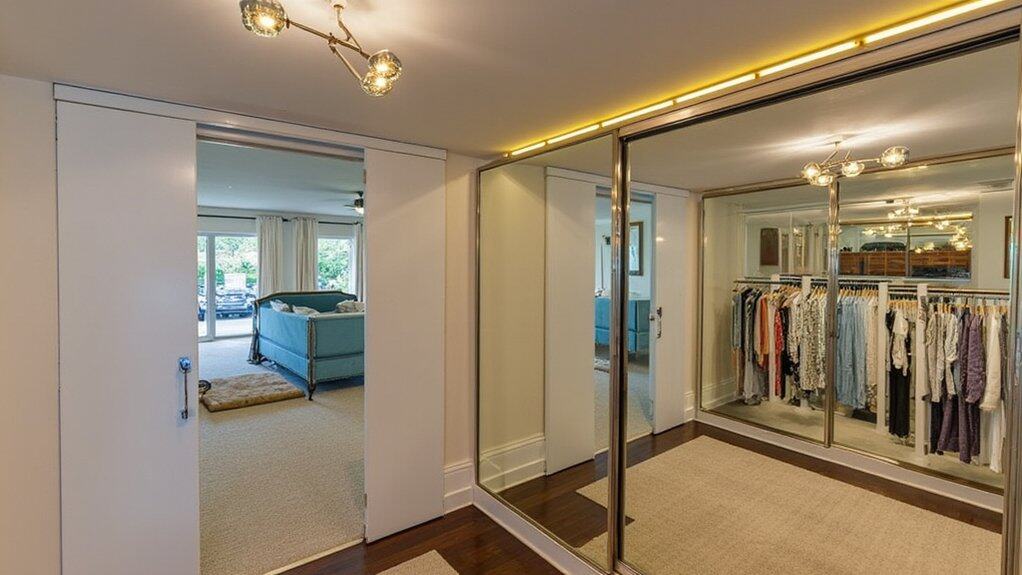 Now that you’ve got your vertical shelving set up, let’s make your small walk-in closet feel bigger with mirrored doors. They reflect space, creating an illusion of depth in tight areas. You’ll notice the difference instantly in a 5×8-foot closet.