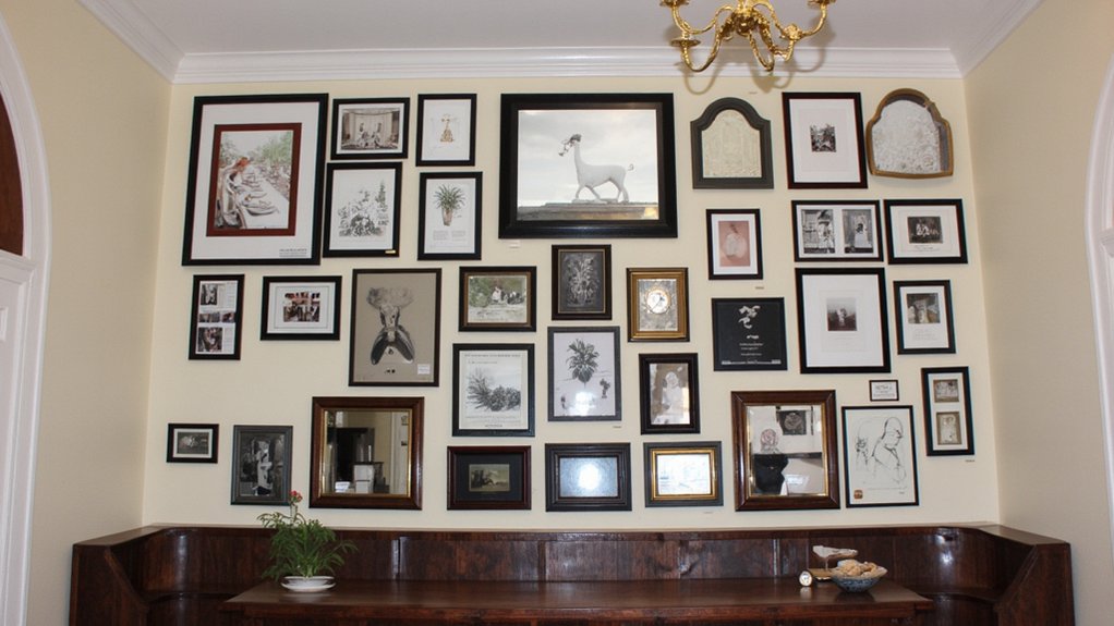 - Combine 15-20 framed pieces in varying sizes (8×10 to 24×36 inches)