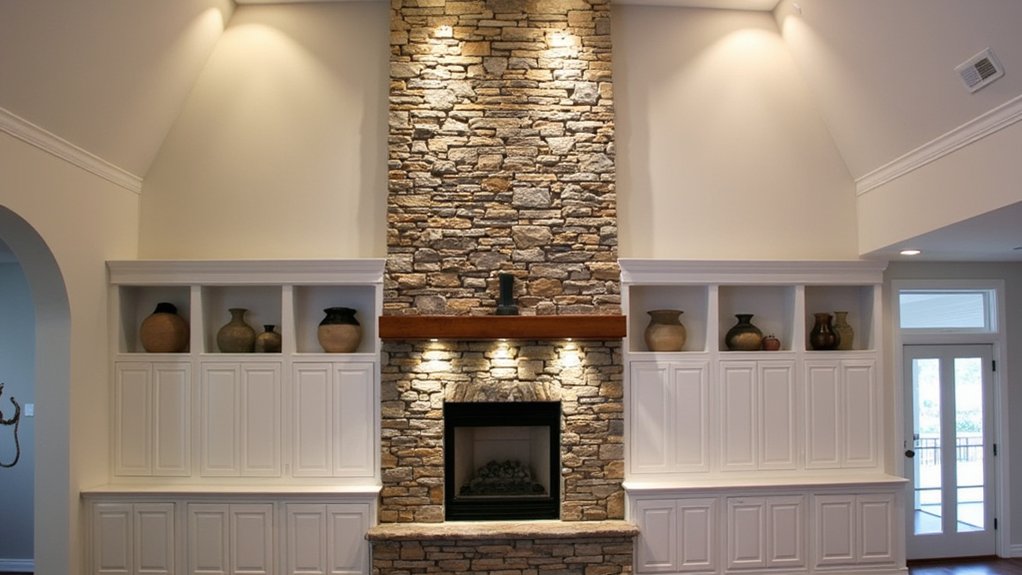 - Incorporate built-in storage niches or artwork alcoves within the stonework