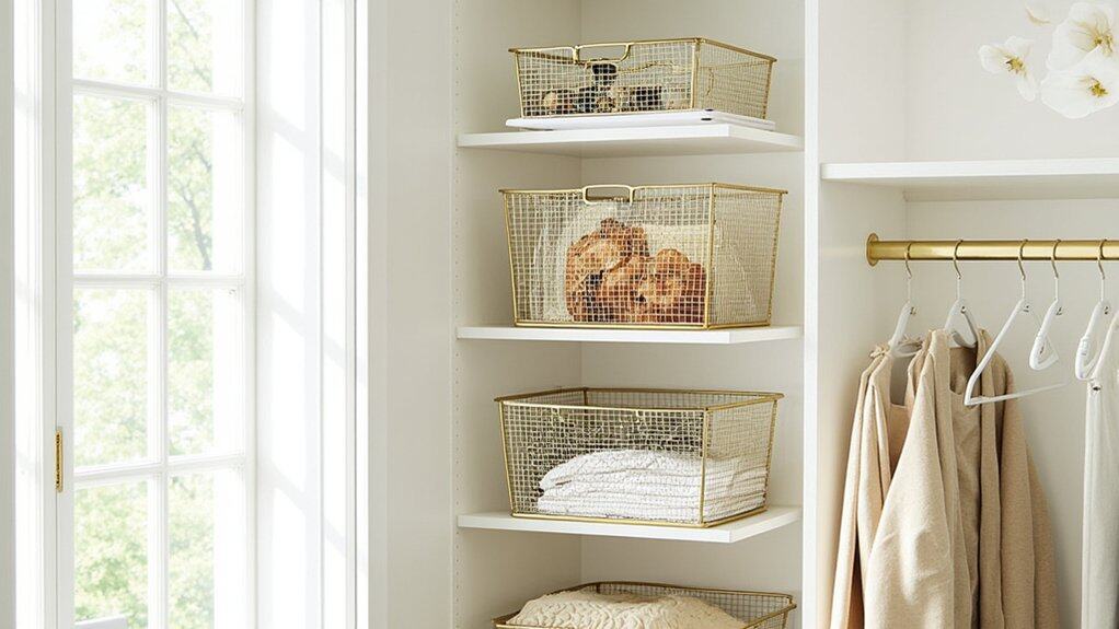 Moving from shelves to storage, let’s focus on chic wire baskets to boost your walk-in closet’s appeal and order. These baskets aren’t just functional; they add a modern, airy vibe. Install them in under an hour with simple tools.