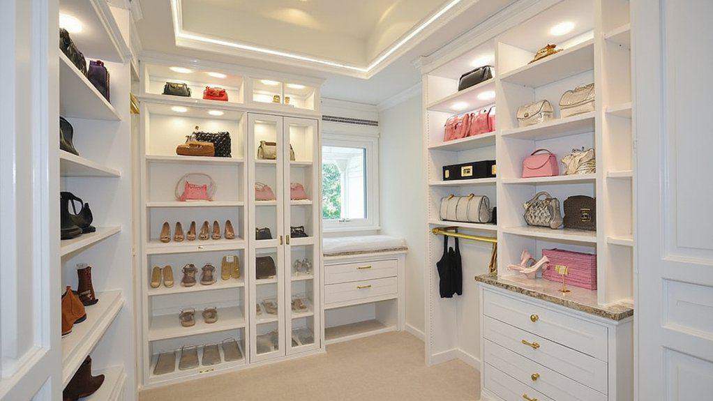While transforming your walk-in closet, elegant shelving solutions can make a huge difference in both style and function. You’ll maximize space and enhance appeal with the right setup. Start by measuring your wall—standard shelves are 12 inches deep.