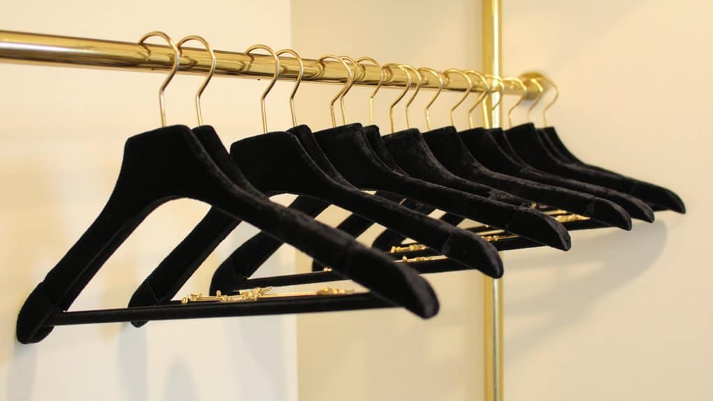 Elegance transforms your walk-in closet when you switch to luxurious velvet hangers for a polished look. These hangers aren’t just pretty; they’re practical, keeping clothes secure with a 0.2-inch thick non-slip surface. You’ll love how they maximize space, fitting neatly in a 5-foot wide closet.